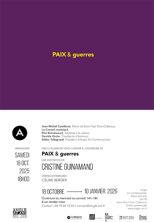 - SAMEDI 18 OCTOBRE à partir de 18h, dans l’espace d’art ANGLE, vernissage de « PAIX & guerres », une exposition personnelle de Cristine Guinamand qui présente ses nouvelles peintures. Extrait du texte de présentation rédigé par Anna RÉMUZON : « PAIX & guerres… un titre au parfum brûlant d’actualité mais qui s’écrit et se lit comme le reflet inversé du roman historique de Léon Tolstoï. Les époques se suivent et se ressemblent… héréditaires. Le présent y regarde le passé… mais aussi l’avenir… pour y semer les pigments d’un espoir intemporel. Car si Cristine Guinamand nous confronte aujourd’hui au même oxymore existentiel que l’auteur russe du XIXe siècle… elle n’en fait pas moins primer la PAIX sur les guerres… » Retrouvez l’intégralité du texte sur notre site.